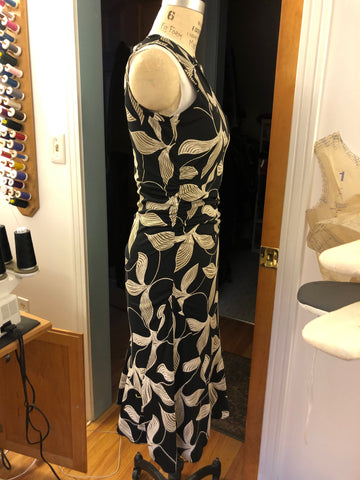 Overall, this dress sews together easily. I don't really like the instructions for inserting the godet. They have you sew the front and back upper pieces to the lower pieces, sew them together at the side, ending at the dot where the godet attaches, then sew the godet into the bottom. This makes it harder to get a nice sharp point at the godet.