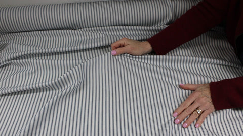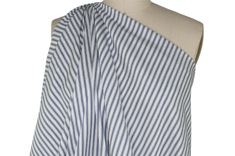 This lovely cotton has a super soft hand and a woven stripe that's evocative of mattress ticking. It has beautiful drape. It's so lovely against the skin! It's perfect for a classic men's shirt, a blouse, a beautiful dress, or a skirt.