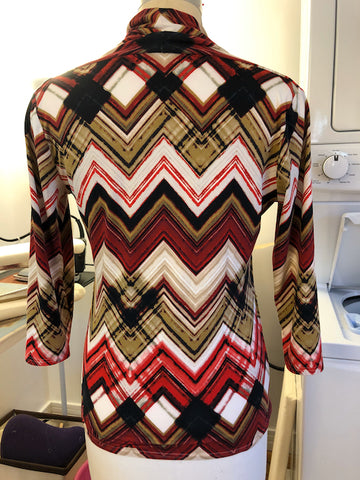 This top goes together very easily. If you use a plain or random-print fabric. I, on the other hand, decided to challenge myself by using a chevron motif. My primary concern was matching the chevrons at the center front seam. I did this by laying out the pattern and marking the match points very carefully. I basted the fronts together and checked them for proper matching before stitching the seam permanently. This took some extra time, but the results were very well worth it. Here's a closeup of the CF seam: