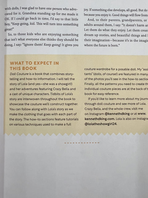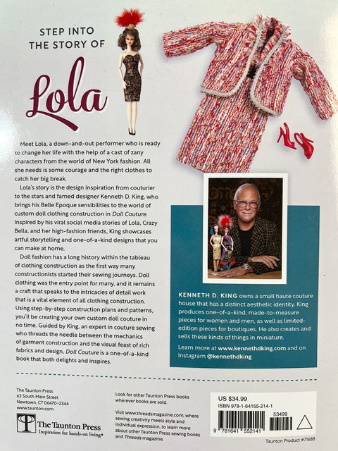 Be enchanted by the story of Lola, the former showgirl, and her sweet tale of redemption through friendship and the power of clothes. This book, a sewing bestseller on Amazon, includes patterns for all of the outfits highlighted in the story. And it's autographed by Kenneth D. King! It includes instructions on how to make the garments, and techniques that work for real-life couture as well as fashion doll couture.